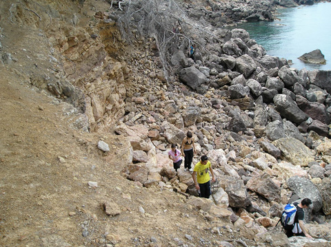 El descenso a las rocas es muy inclinado y resbaladizo.