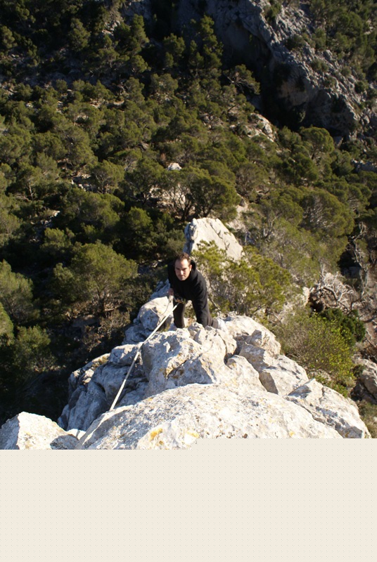 El n'Alí es una montaña o un pico de 1038 m. de altura, aunque partiendo del coll de sa Batalla el desnivel es aproximadamente de 450 m., que no es gran cosa, pero en esta ocasión en vez de subir por el sendero habitual, lo hacemos por la arista que empieza en el pas de n'Arbona y llega hasta el pico. Al principio no está claro donde empieza la arista, pero en cuanto se sube un poco se ve mas claro. En esta arista hay dos cortes en los que es necesario hacer rapel para salvarlos y hay tramos que son escalada de nivel bajo, algunos tramos de nivel 4. Durante la ascensión hay varios puntos en los que es facil salirse de la arista. Desde el punto de vista de un esclador esta subida no presenta ninguna dificultad, pero tratándose de senderismo la dificultad es máxima, puesto que incluso en parte se sale de lo que es estrictamente senderismo.