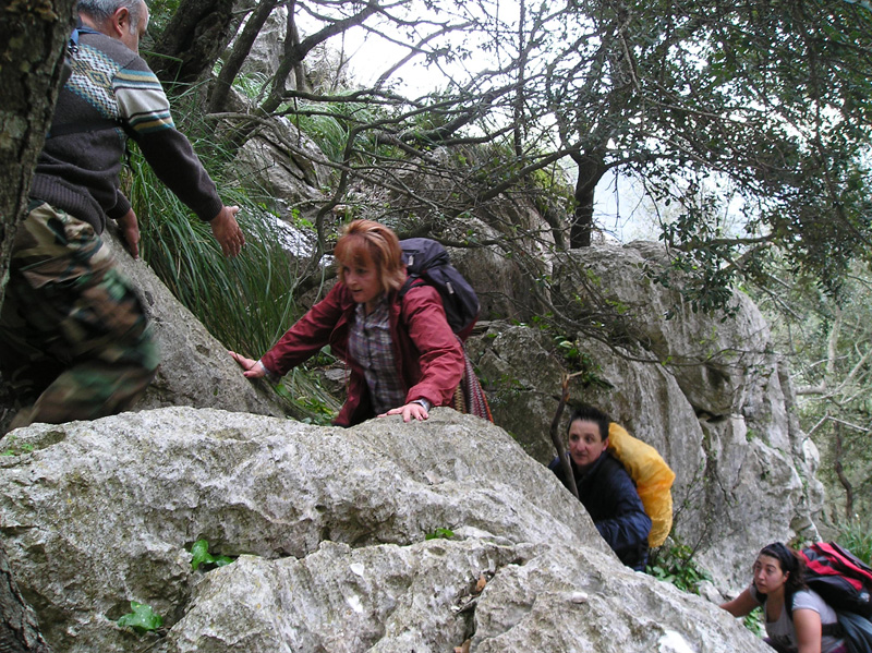 Con cuidado, sobre todo por estar las rocas mojadas por una débil lluvia que nos acompaña todo del rato.