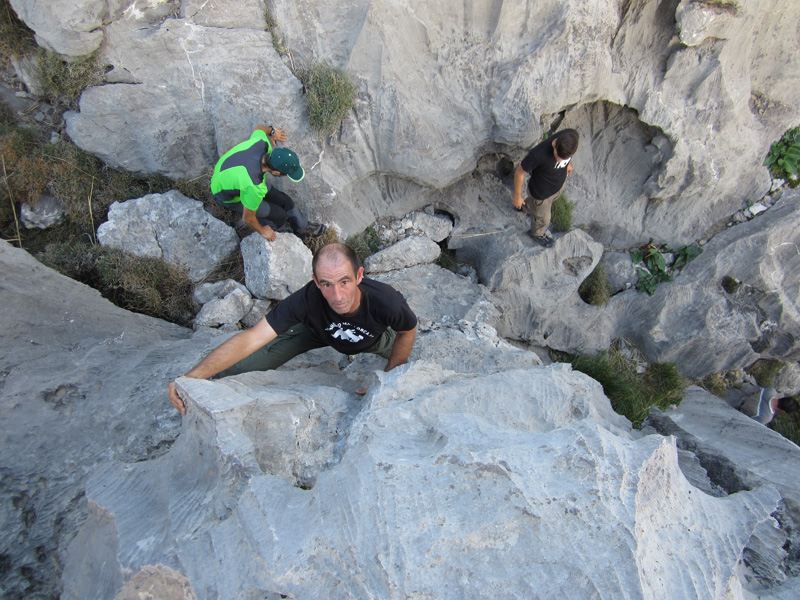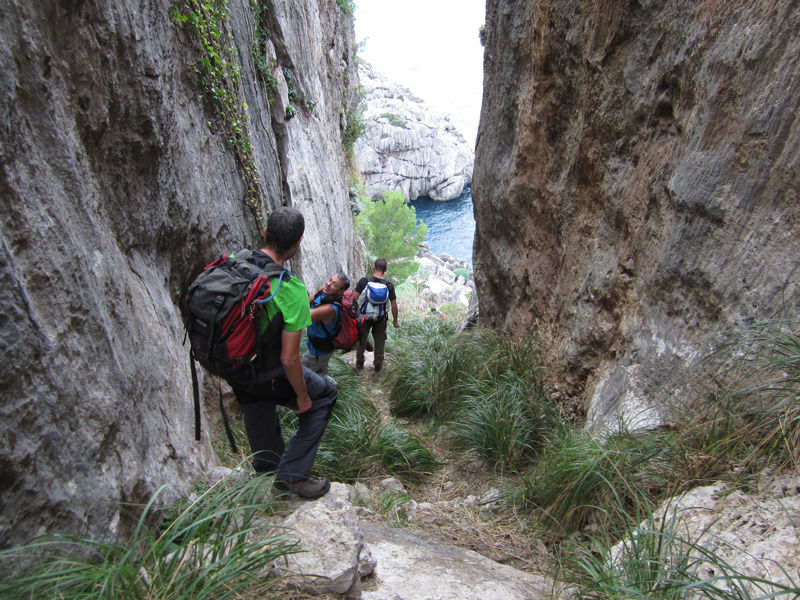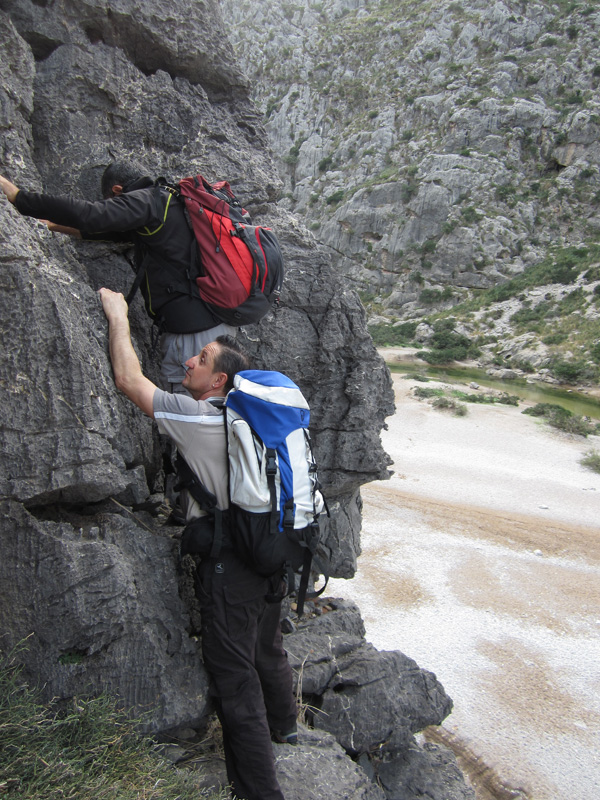 El inicio de esta excursión es verdaderamente brusco. A muy poco de empezar subimos el pas des Morro. Un paso que está en la misma playa del torrente de Pareis. Es bastante vertical y largo, por lo que a pesar de no tener demasiada dificultad tecnica, impresiona. Seguimos a Luis Redondo, conocido por los Raconers como "Coyote", que es el único que lo ha subido con anterioridad. subimos el paso sin cuerdas para asegurar, aunque es recomendable hacerlo. Hay algunos anclajes con mosquetones. La subida por este paso nos situa cerca del Morrro de sa Vaca, al cual vamos despues de una parada para la merienda. A continuación subimos el Tormàs. Otra subida con dificultad, hay que hacer unas buenas trepadas.